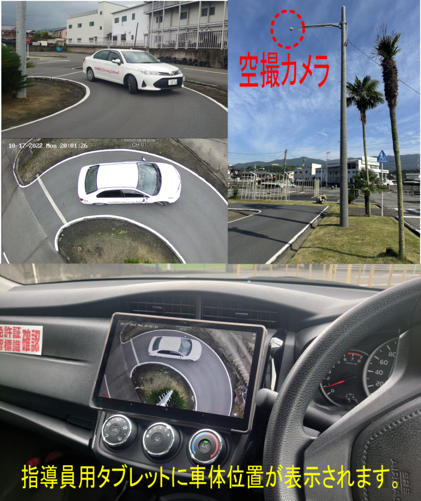 特に車体感覚の習得が難しい「クランク」や「S字」などの課題コースでは、上空に設置したカメラの映像をタブレットに映し出すシステムを活用