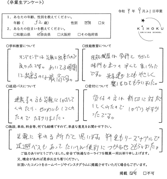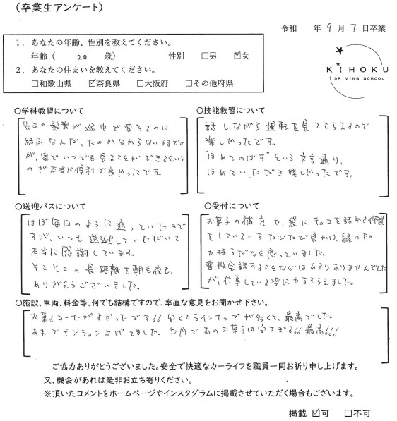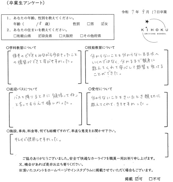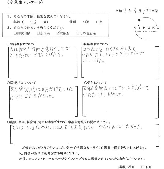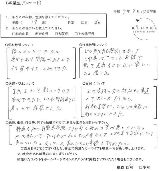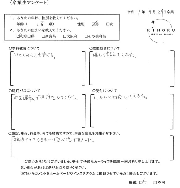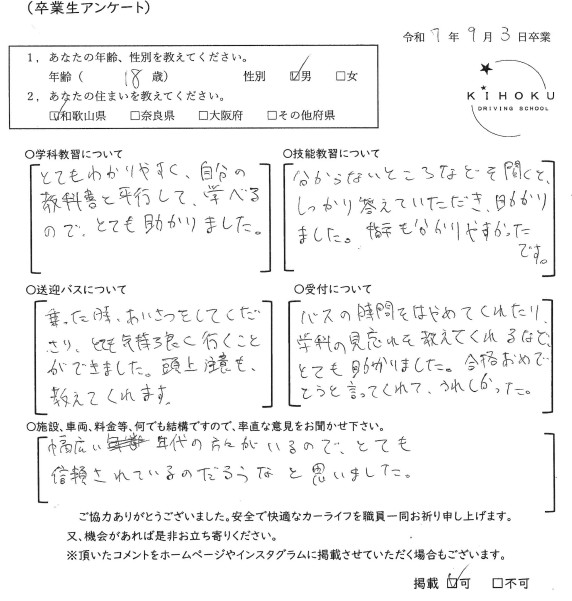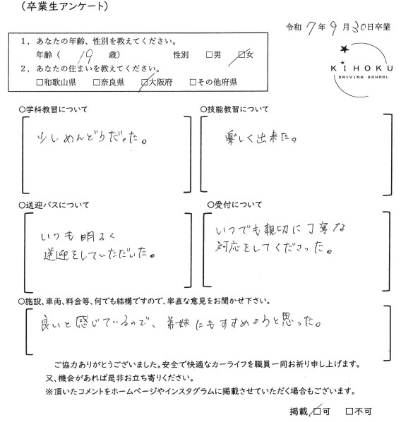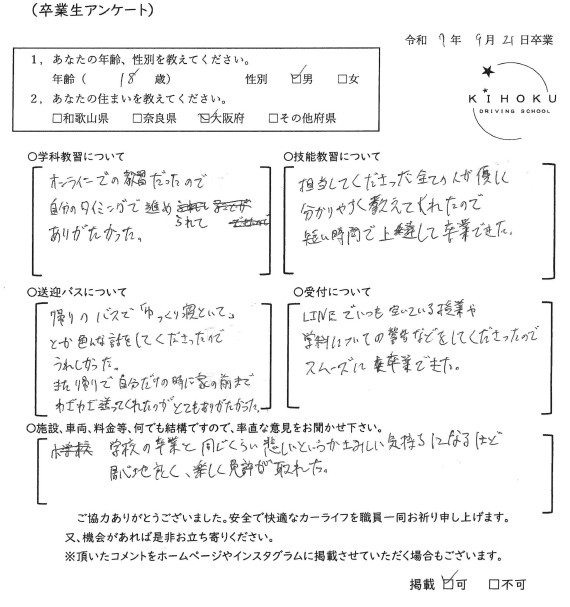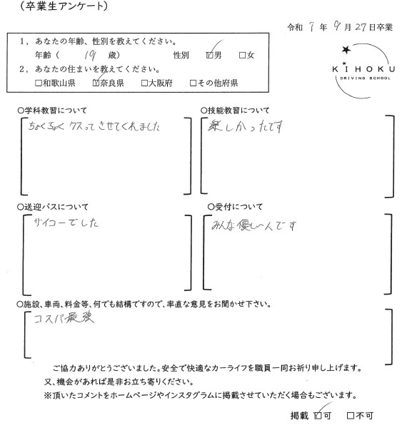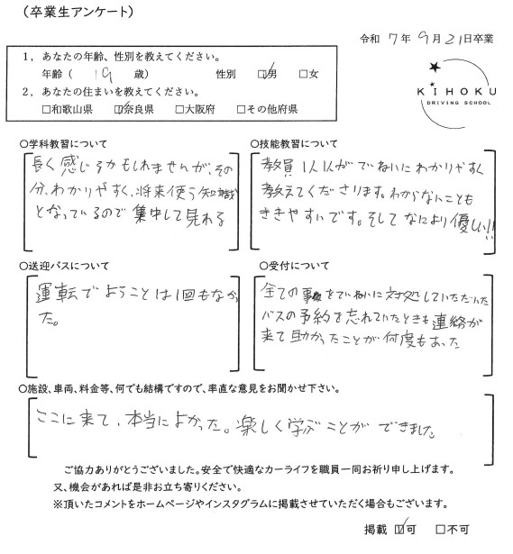 令和7年9月の卒業生の声 2025年9月30日 最終更新日時 : 2025年11月12日 kihoku_admin 大阪府19歳 和歌山県18歳 奈良県19歳 奈良県52歳 奈良県33歳 大阪府18歳 奈良県19歳 奈良県18歳 大阪府22歳 奈良県19歳 奈良県20歳 大阪府18歳 大阪府19歳 和歌山県18歳