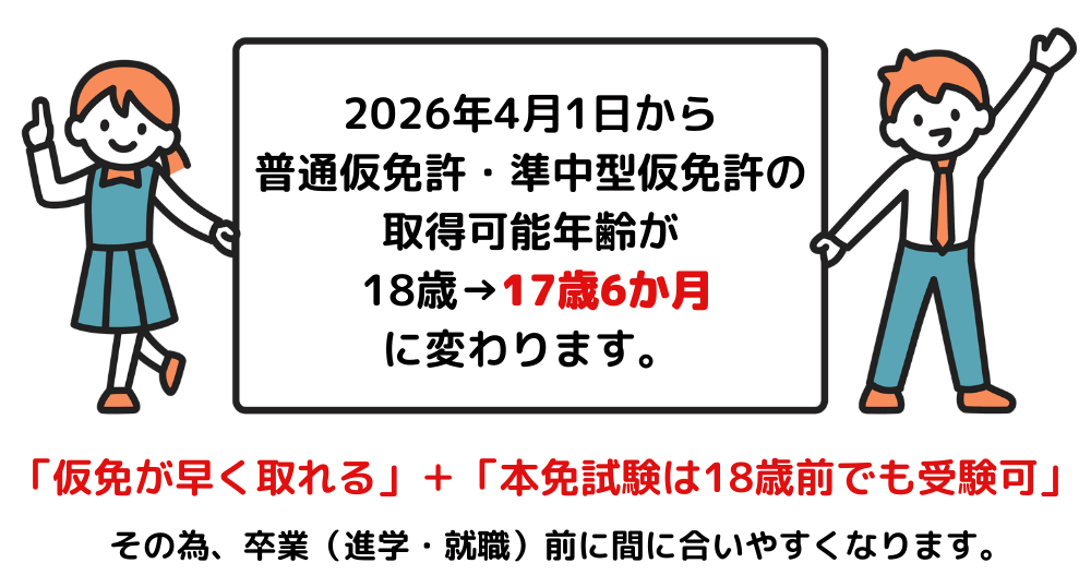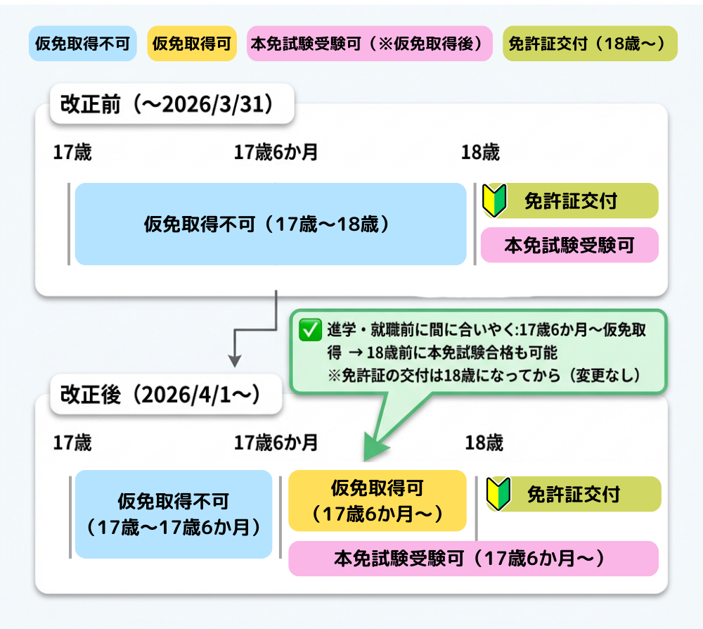 改正後は、17歳6か月〜仮免取得 →(練習)→ 17歳6か月〜本免試験受験可 → 18歳で免許証交付、という流れが取りやすくなります。