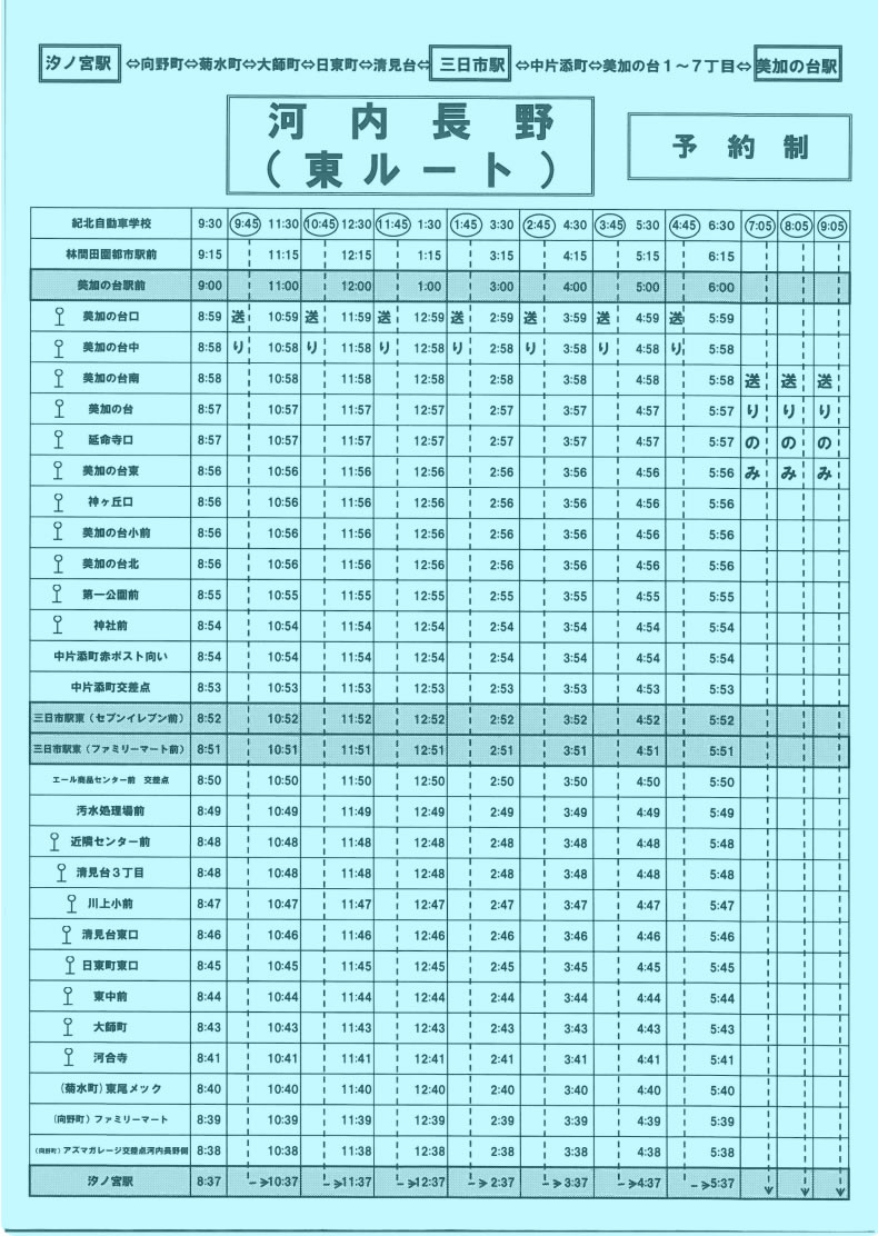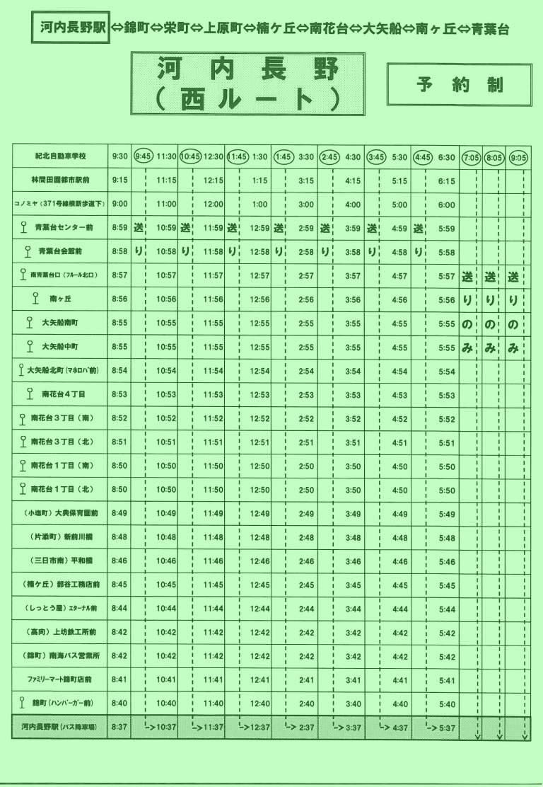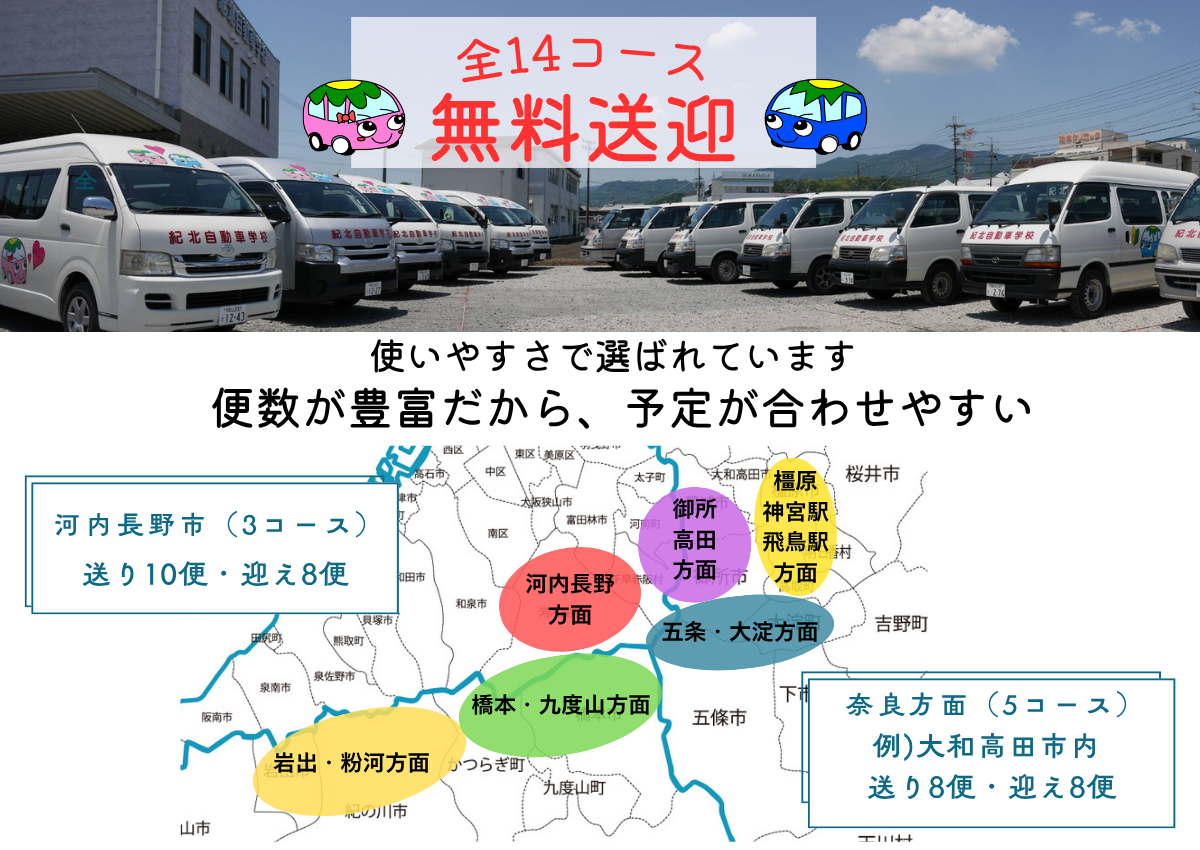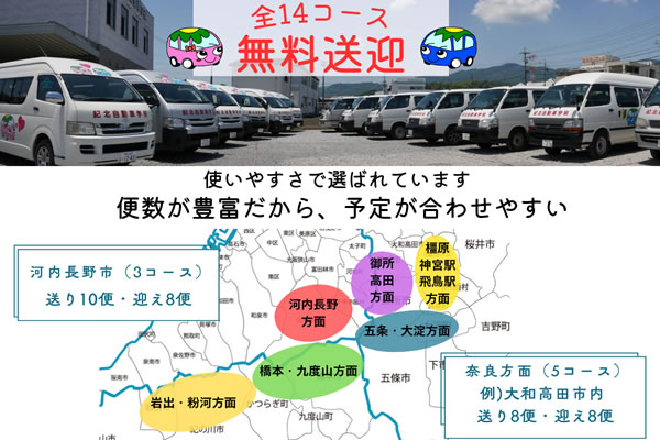 大 阪河内長野(東)・(西)・千代田 全14ルートの無料送迎バスが運行しています。
