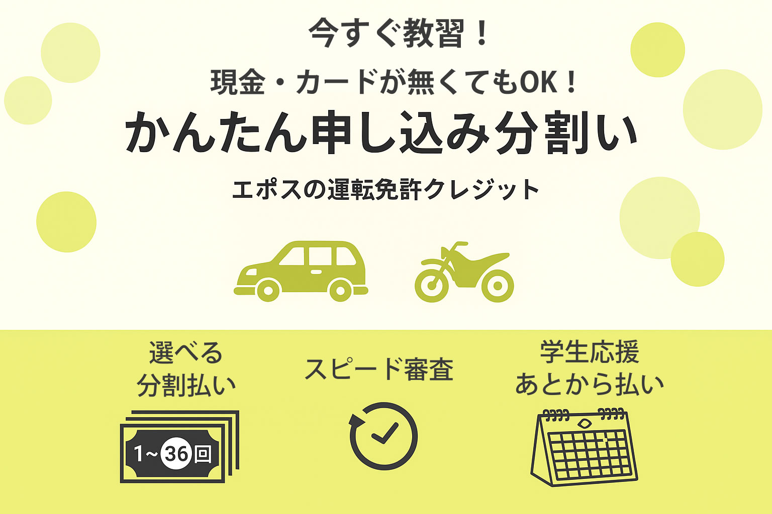 運転免許取得をお考えの皆様へ、当教習所ではエポスカード運転免許クレジットもご利用頂けます!ご自分の都合に合わせてお支払い!