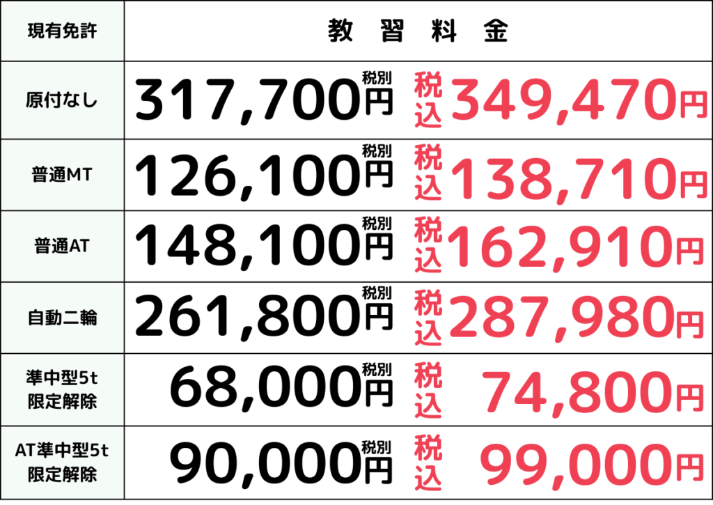 - 金額は高速教習料金(実車走行)を含む料金です。